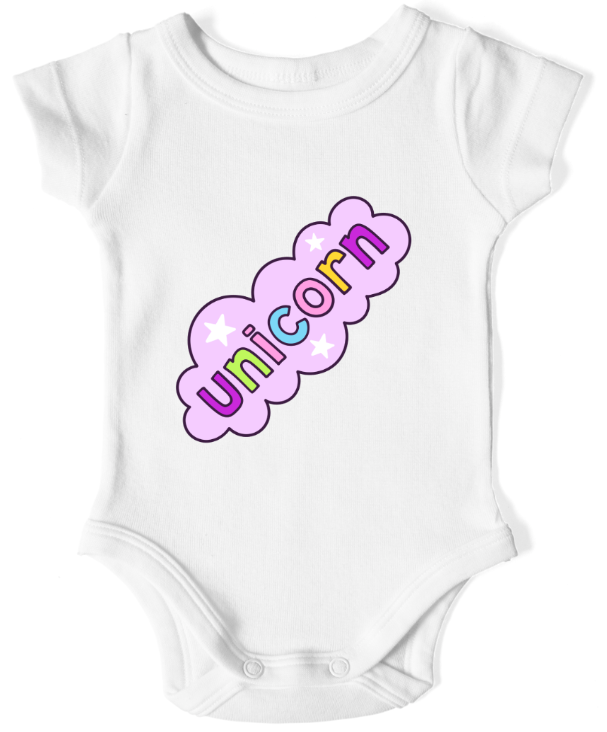 Body Unicorn Dream to propozycja dla tych, którzy kochają minimalizm z nutką fantazji. Głównym motywem jest puszysta, fioletowa chmurka z białymi gwiazdkami, w którą wpisano radosny, kolorowy napis „Unicorn”. To ubranko, które sprawia, że każdy dzień (i każda drzemka) staje się odrobinę bardziej magiczna.