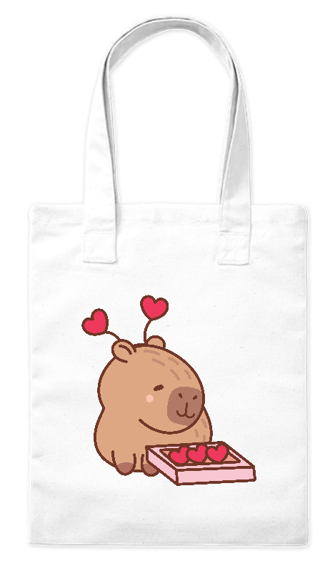 Kapibary podbiły internet swoim spokojem, a teraz podbiją Twoje serce w wyjątkowo słodkim wydaniu! Nasza nowa torba z motywem „Zakochanej Kapibary” to połączenie najmodniejszego zwierzęcego trendu z romantycznym akcentem. Grafika przedstawia uroczo zilustrowaną, brązową kapibarę z przymkniętymi oczami, która z zachwytem spogląda na pudełko czekoladek w kształcie serc. Całości dopełniają dwa serduszka na uroczych czułkach, nadające projektowi zabawnego i unikalnego charakteru.