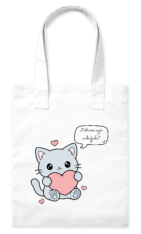 Szukasz sposobu, aby w nieszablonowy i uroczy sposób zapytać bliską osobę o bycie Twoją Walentynką? Nasza nowa torba z motywem słodkiego szarego kotka to propozycja, której nie da się odmówić. Ilustracja przedstawia małego kotka z wielkimi oczami, trzymającego różowe serce, z komiksową chmurką zawierającą pytanie: „Zostaniesz moją walentynką?”. Całość uzupełniają delikatne, różowe serduszka unoszące się wokół postaci.